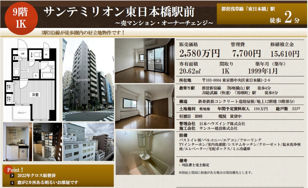 人形町不動産TOP > 人形町不動産株式会社 本店のブログ記事一覧 > サンテミリオン東日本橋駅前 9階